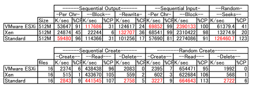 このあと、まずXenの準仮想化(CentOS)でbonnieだけ試してみました。